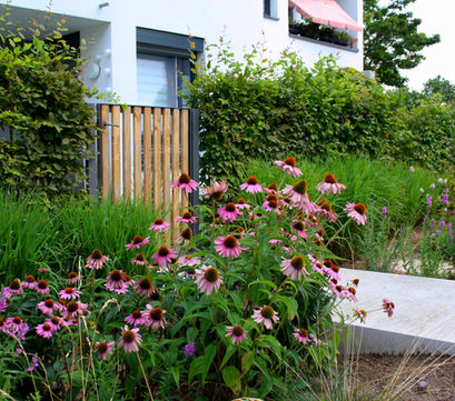 Wiesbaden Neubau 5 Stadtvillen: Naturnahe Pflanzung mit Bienennährgehölzen, Obstgehölzen, Blühstauden und Hochstämmen und weitläufigen Grünflächen im Rahmen der Grundstücksmodellierung.